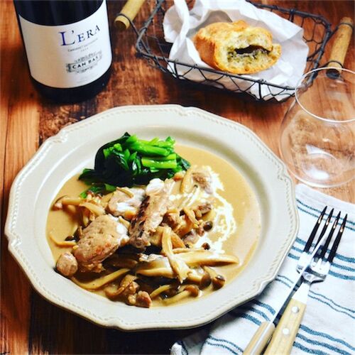 いつもの味噌豚も ちょっとアレンジしたら ワインとパンがよく似合う 洋風お総菜にはやがわり~。。。 で今夜もかんぱ~い>>> 味噌豚でストロガノフ風☆きのこたっぷり♪ きのこで味噌豚の油ハネを防ぎます! 豆乳で味噌豚ときのこの旨味をまとめて、 洋風…