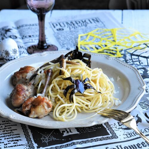 ハロウィンの料理は いろいろ楽しさ半分 めんどう半分だけど、 手軽にできるスパイスミックスと 身近な食材を使って、 魔女になったつもりで。。。 魔法の杖でナスを蜘蛛に変えてみてはいかがでしょう。。 ヒッヒッヒ クモの巣ペペロン*スモークチキン添え …