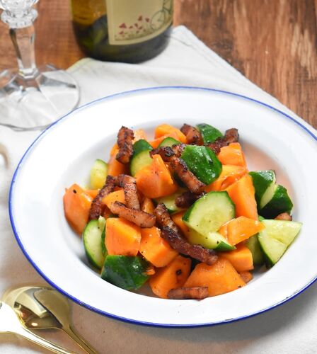 柿のオレンジ色は 夕焼けの色に似てなんだかちょっと ものわびしさがありますねー 今年ももう暮れ、 深まる秋に 柿食えば…。ですね〜 柿ときゅうりのフレンチサラダ ベーコンの塩気で柿の甘みがよく引き立ってぽりぽりした食感もクセになる☆緑とオレンジの彩…